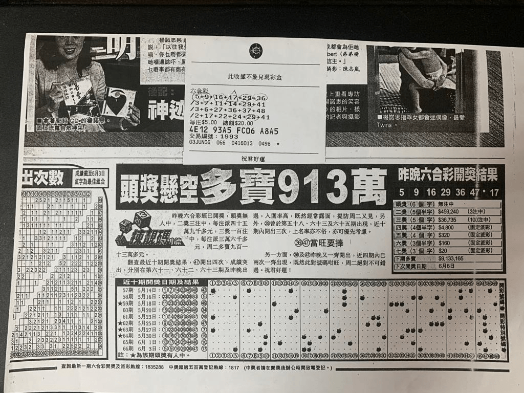 有日早上、突然來到我舖頭門口,當時很早!舖頭內的我 正準備開鋪做生意,見來人,就同佢開玩笑,來人笑笑口對住我 蓮子蓉咁面口同我笑 、我在想? 唔通佢中咗馬仔三T之類大獎,就問來人是否? 中咗馬仔?來人見我估唔中?就同我講開估啦!原來中了六合彩二獎 有成四十貳萭幾港元,來向我道謝!順便俾封利是和答謝我!