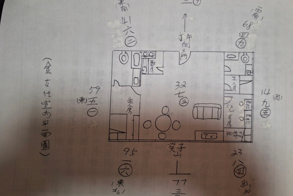 金女仕是筆者過去在某報認識的讀者,那時該報有免费為讀者上門睇風水,還記當時來信非常摧躍,每位讀者來信都希望被抽中,成為幸運兒,有些更不守规遊戲规則,在報館取得筆者私人電話,然後联络筆者,說已經來信報館,久未抽中,想筆者私人免費醒佢睇家中風水,由於我不想破壞原則,一一都被我婉拒,因為筆者原則是抽些私人時間,才為有需要讀者結缘睇風水,其他較忙是執業時間,是收費的,好了!講番正題:是金女仕的家居風水了,現在為大家分柝清楚,金宅位於將軍澳一私人屋苑,大厦為七運落成坐癸山丁向,子山午向,旺星到坐,此大厦四周巒頭环境不差,該大厦四面有大廈護守,前有球埸作明堂,大厦正門有蓋走廊亦作龍吸氣狀,主大厦的人有贵人扶助,内人口平安富貴,可惜!前面有附近大厦客的牆角沖射成天斬煞,會令住客容易受傷或開刀。回說單位,大門口在南方,纳86吉星組合,紫白訣云:「武曲青龍,喜逢佐鞴善曜」。.